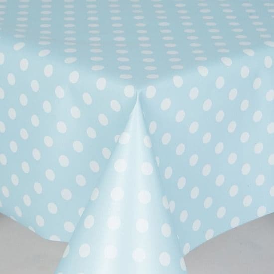 Wipe clean vinyl table covering. Purpley/blue back ground with white polka dots.